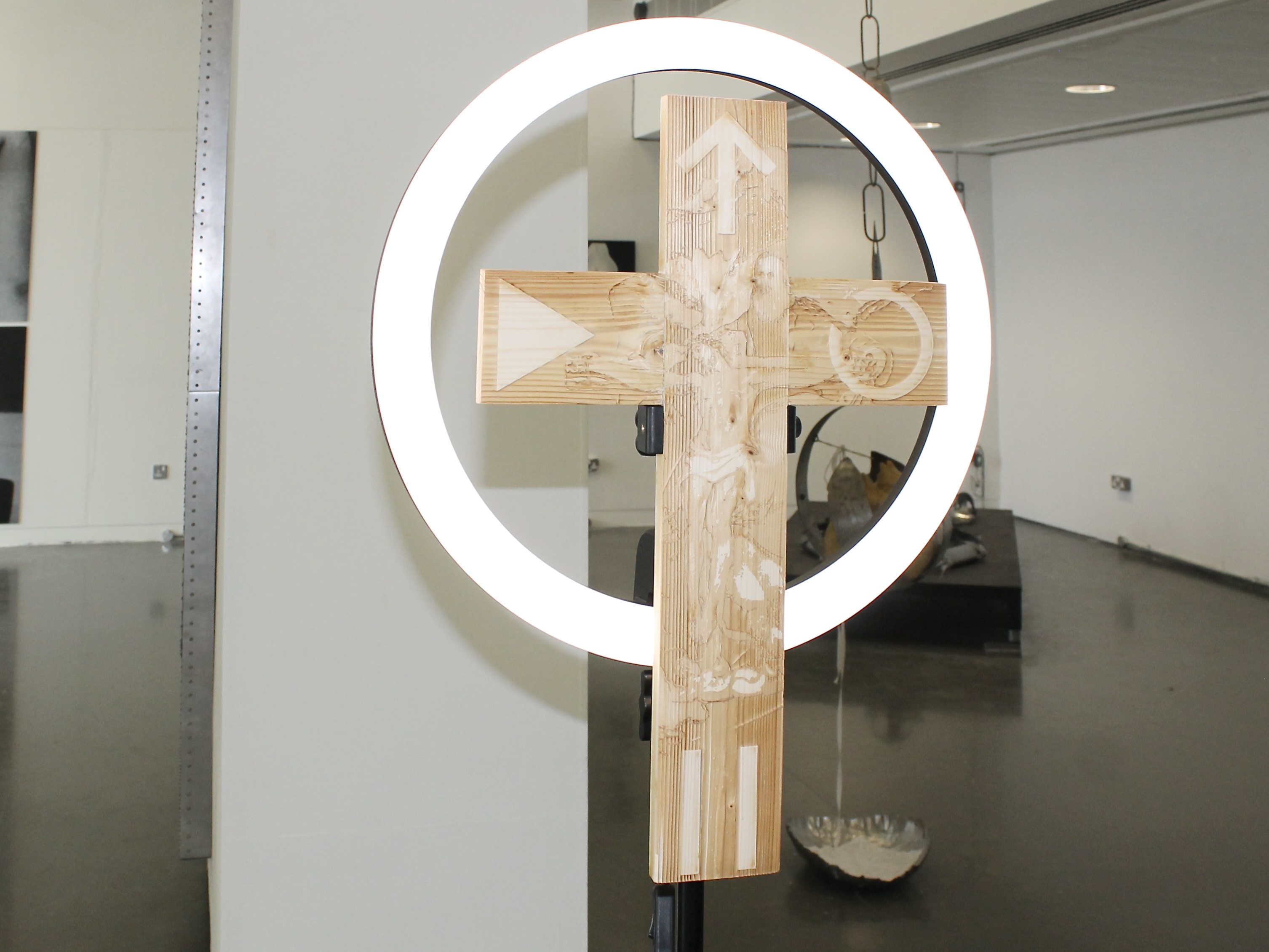 LED ring light, laser-engraved drawing on pine cross