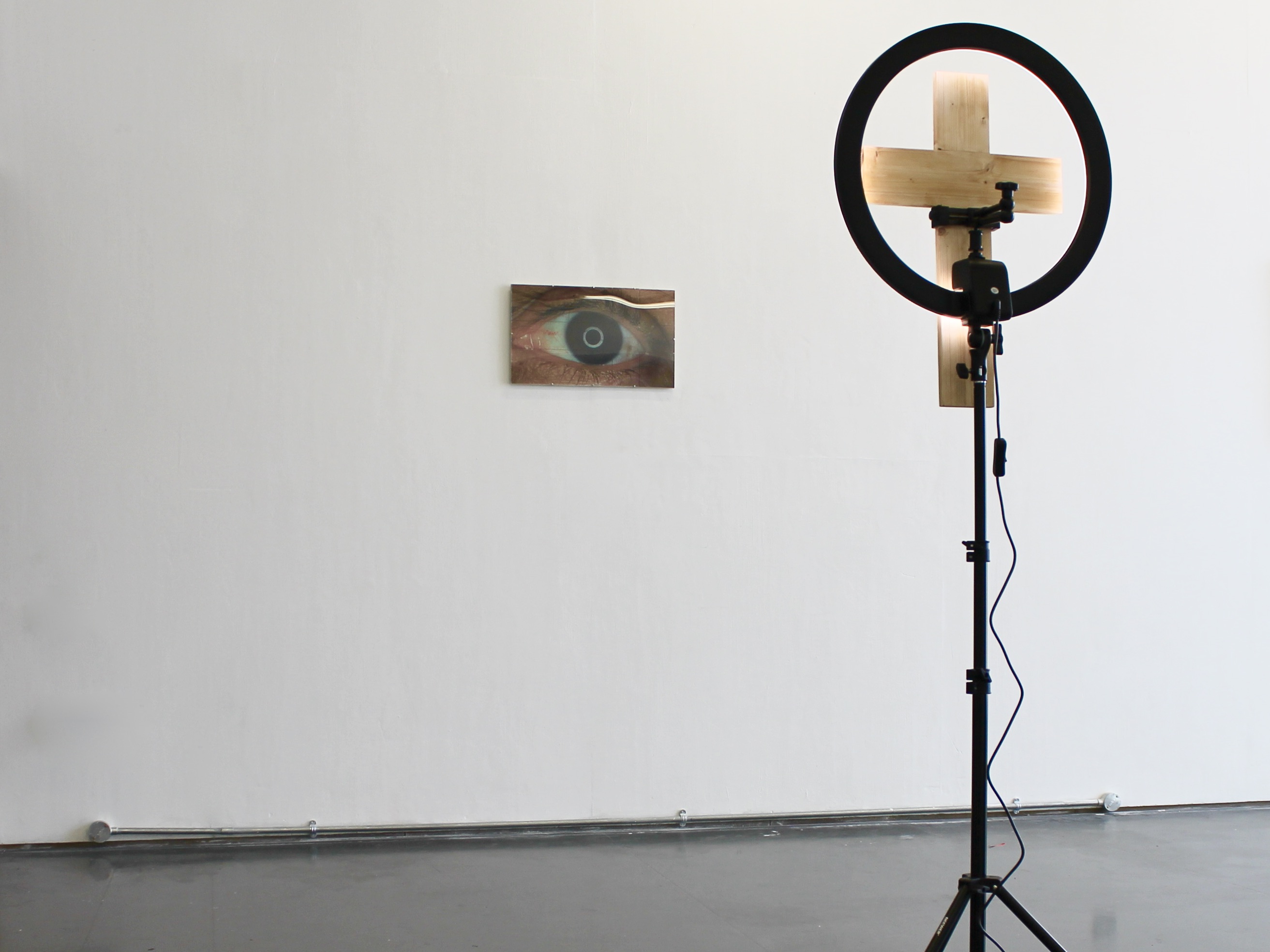 The work explores our relationship to the sublime, through the religious order of the cross and the body facing technology. A stock image of an eye reflecting a ring light references the body; both the viewer and subject. The body in this speculation is not a particular body, but rather a replacable sign in a world of perfomative relations; afflicted with desire to perform for the eye it is facing: the camera.